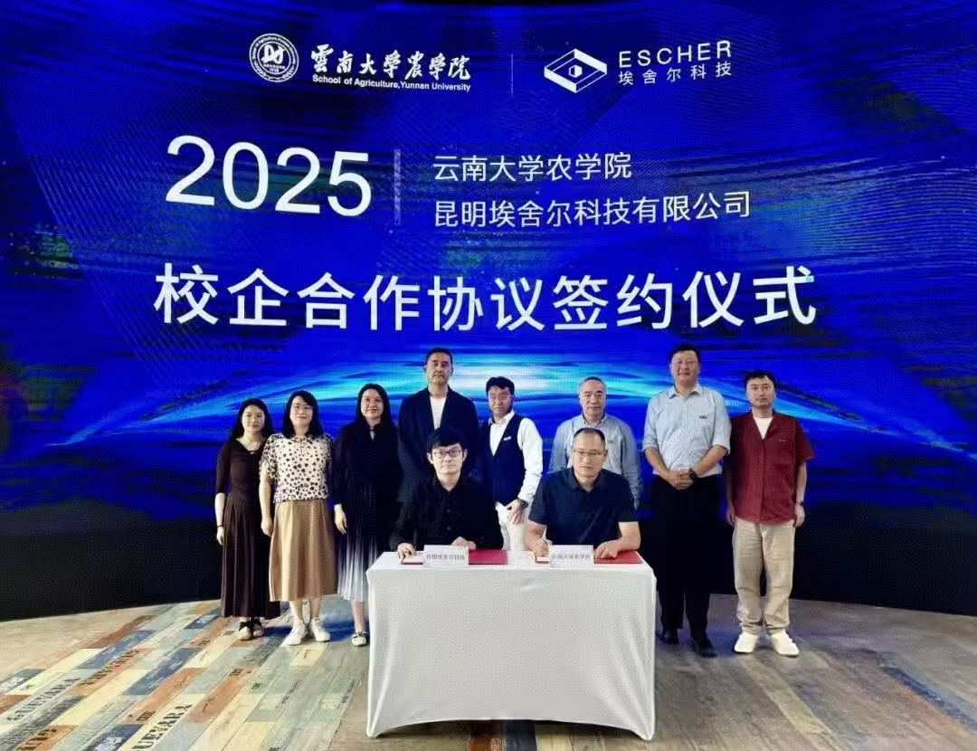 近日,云南大学农学院与埃舍尔科技签订产教融合合作协议。昆明埃舍尔科技有限公司董事长杨杰、总经理王轶、运营副总姚敏婷,云南大学农学院党委书记崔茂乔、院长胡凤益、院党委副书记王崴、副院长曾倩、汤开磊,以及双方相关负责人参加签约仪式。