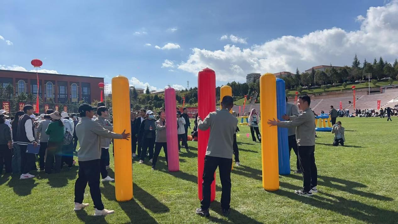 同样在“不倒石柱”和“同心鼓舞”等项目中,农学院教职工通过不断沟通协作完成挑战。在稳桩、托鼓的关键时刻,教师们相互提醒、彼此弥补,让比赛既紧张又充满欢乐,充分展现了团队合作的力量。