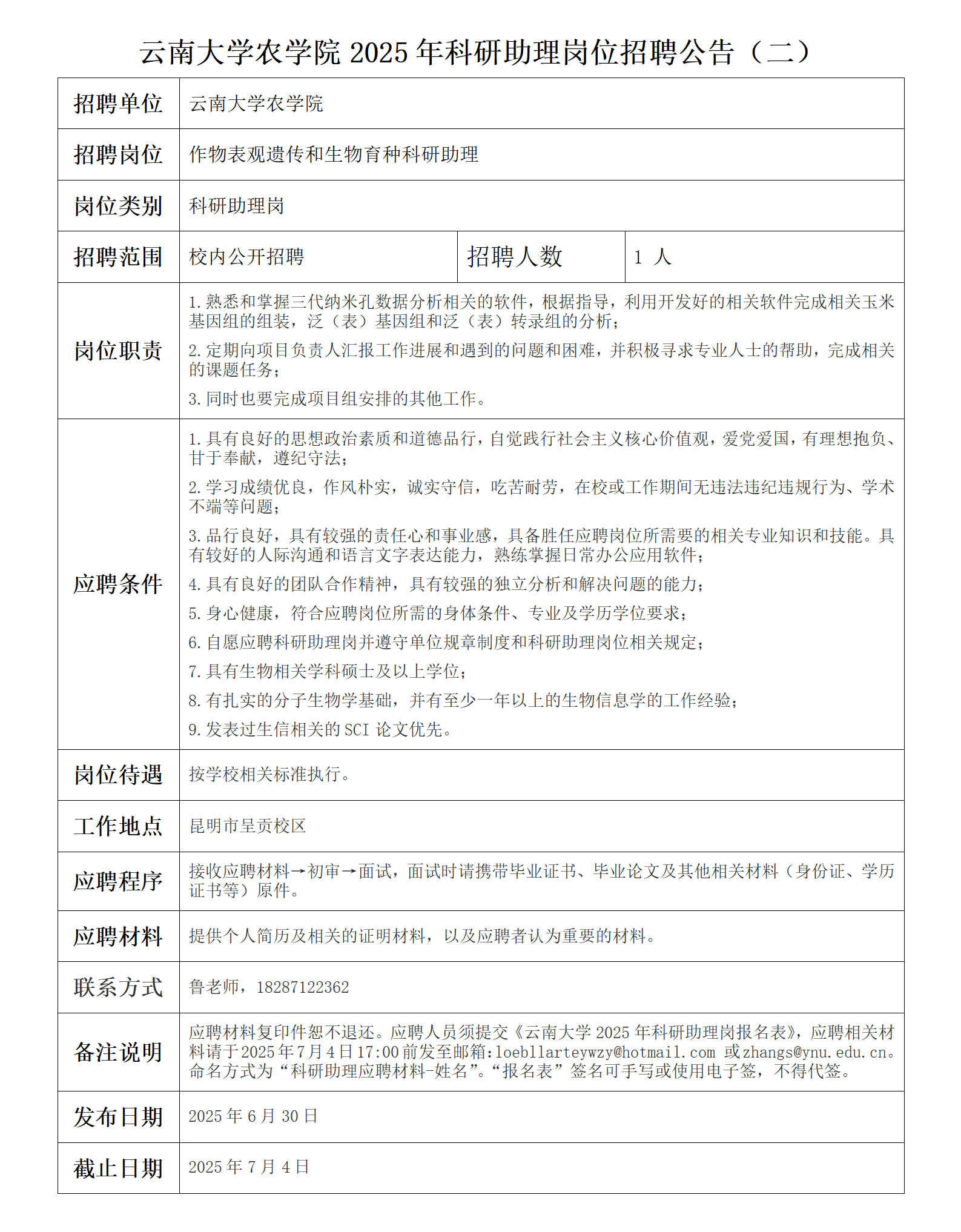 云南大学农学院2025年科研助理岗位招聘公告(二)